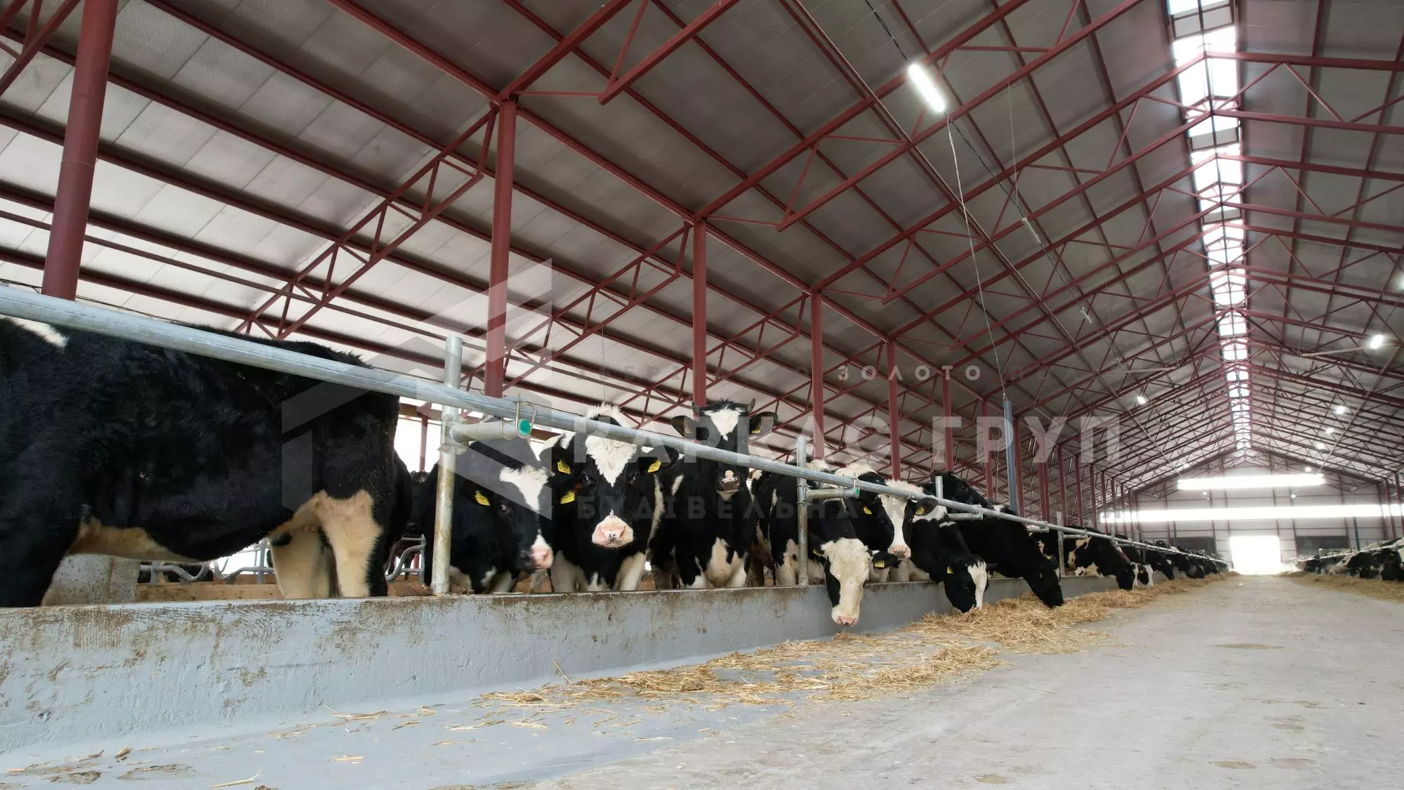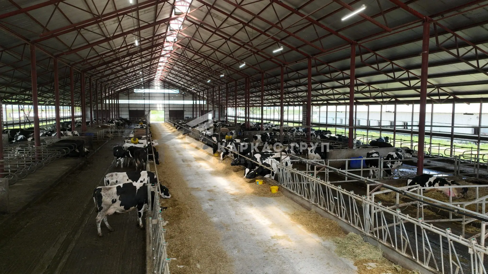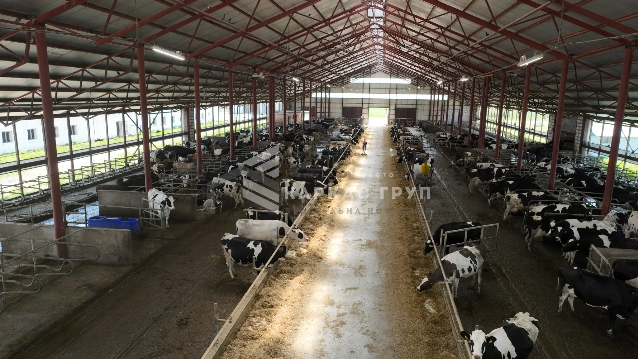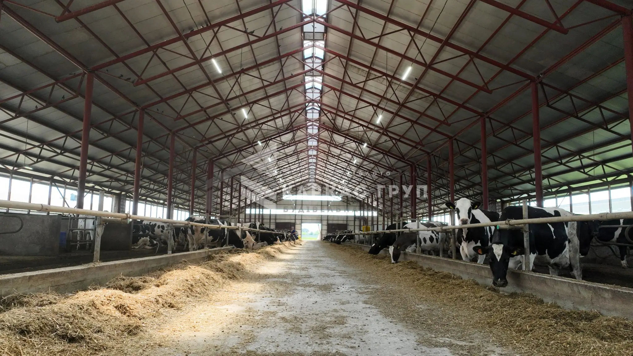 Корівник побудовано з металевого каркасу та оброблено від корозії. Це дозволило швидко і з оптимальними витратами звести будівлю. За рахунок того, що кормовий стіл знаходиться посередині було встановлено дві додаткові опорні колони, за рахунок яких вдалось зменшити металомісткість ферм.
