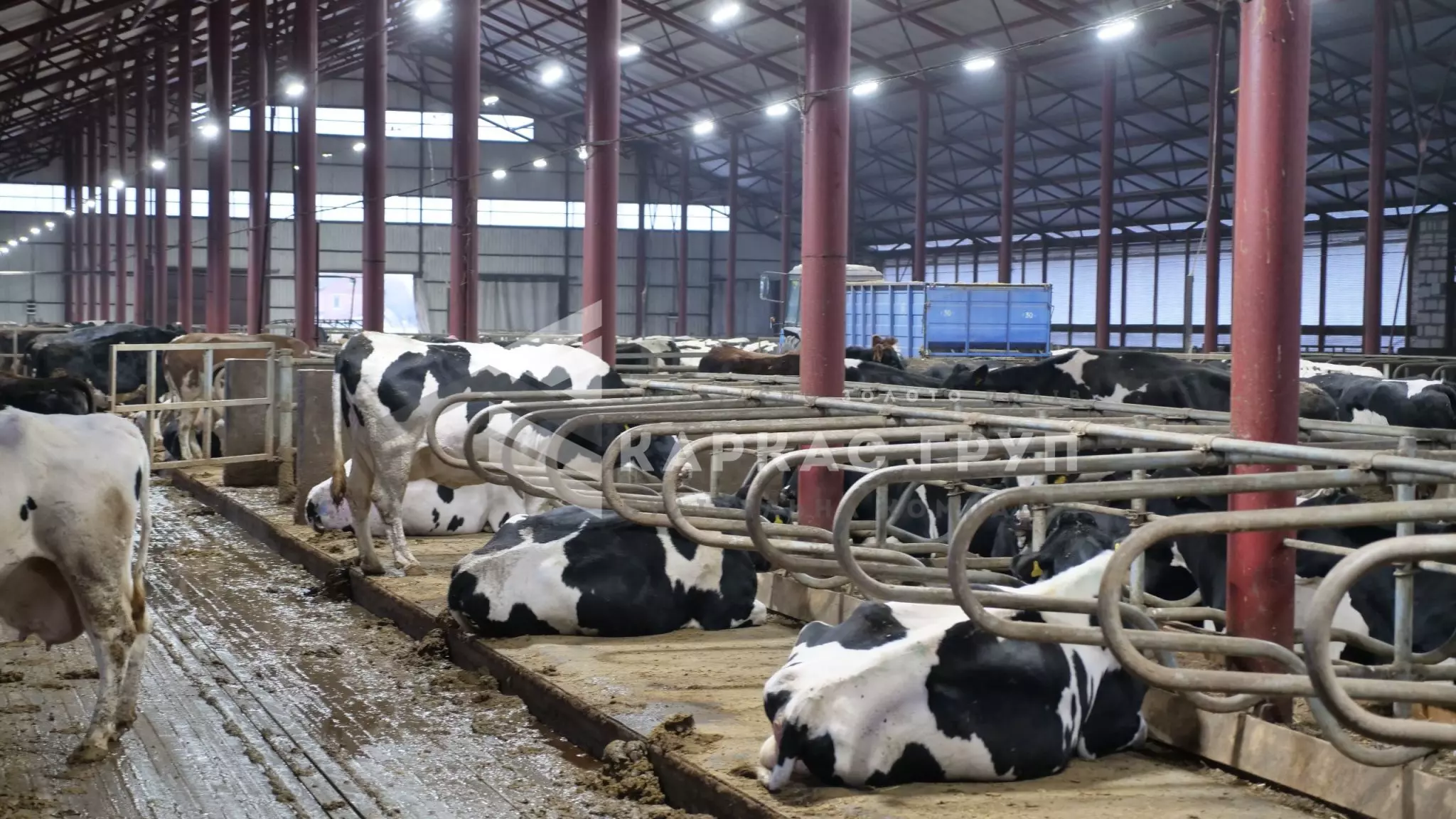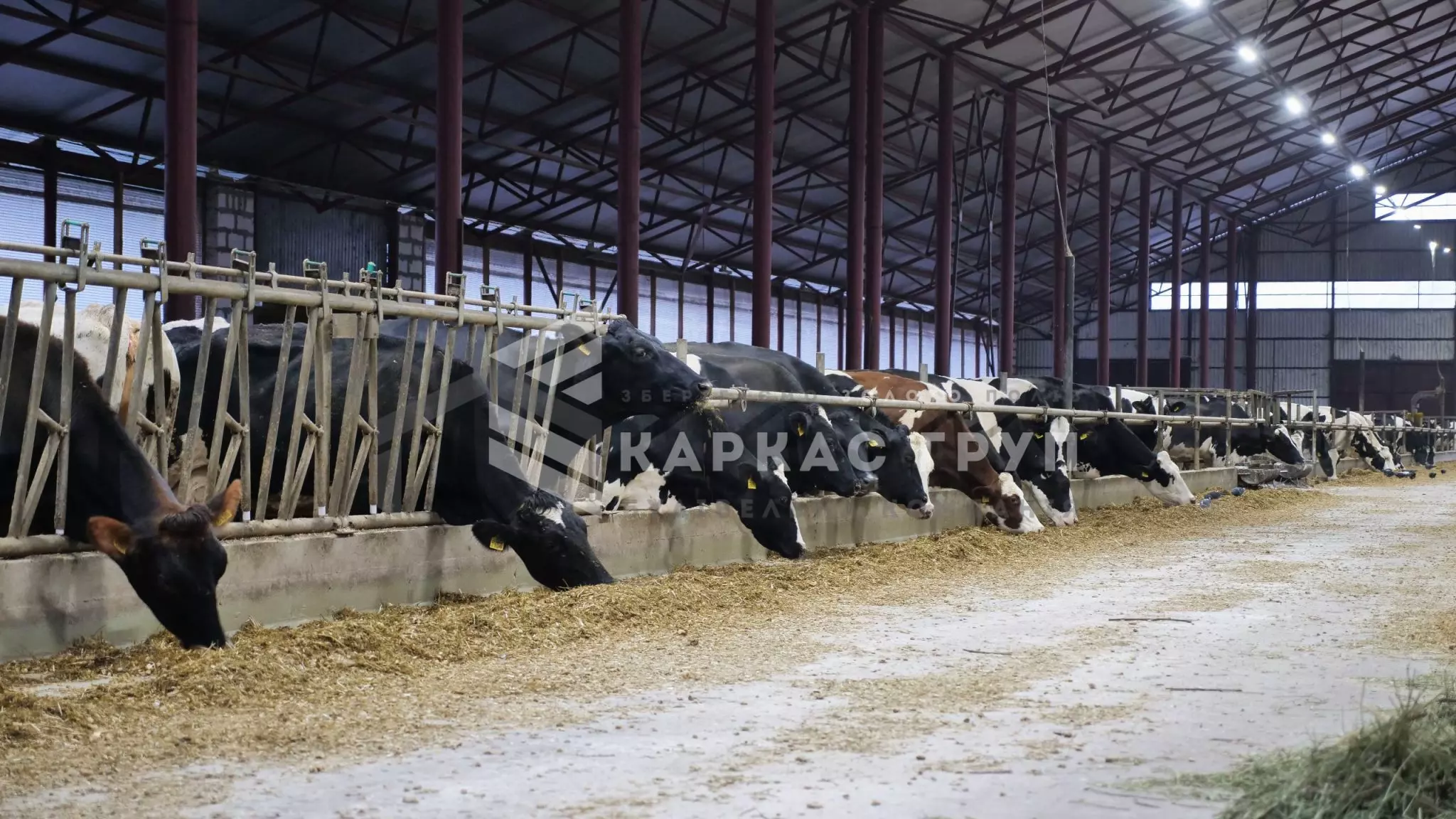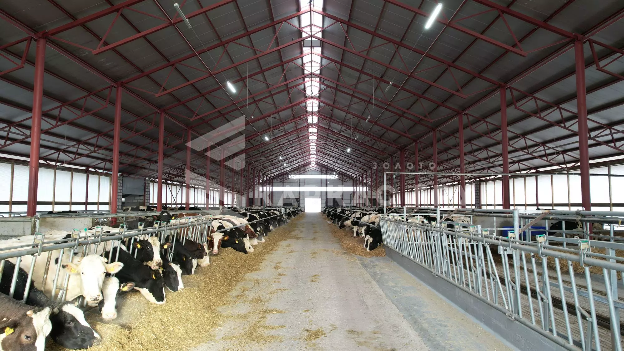Корівник побудовано з металевого каркасу та оброблено від корозії. Це дозволило швидко і з оптимальними витратами звести будівлю. За рахунок того, що кормовий стіл знаходиться посередині було встановлено дві додаткові опорні колони, за рахунок яких вдалось зменшити металомісткість ферм.