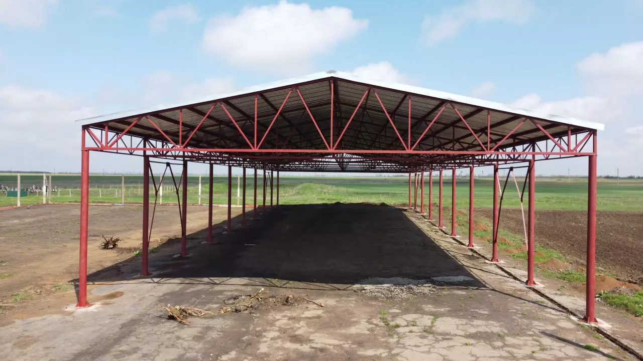Одна із сторін навісу повністю відкрита, для великого притоку повітря та обдуванню всього шару насипу, також це дає доступ для маніпуляцій з продукцією з усіх точок, а у випадку зберігання техніки під навісом, дає змогу вільного її переміщення та розташування.