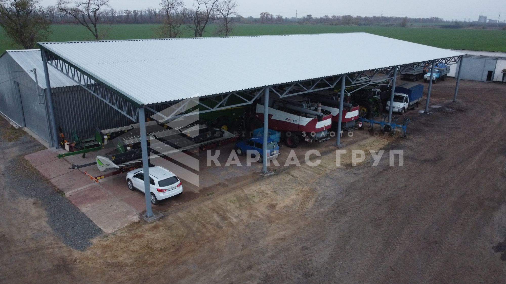 Один із найпопулярніших запитів – це навіс для зберігання техніки. Даний проєкт дозволяє розмістити до 8 тракторів, 10 єврофур або 14 цивільних автомобілів.