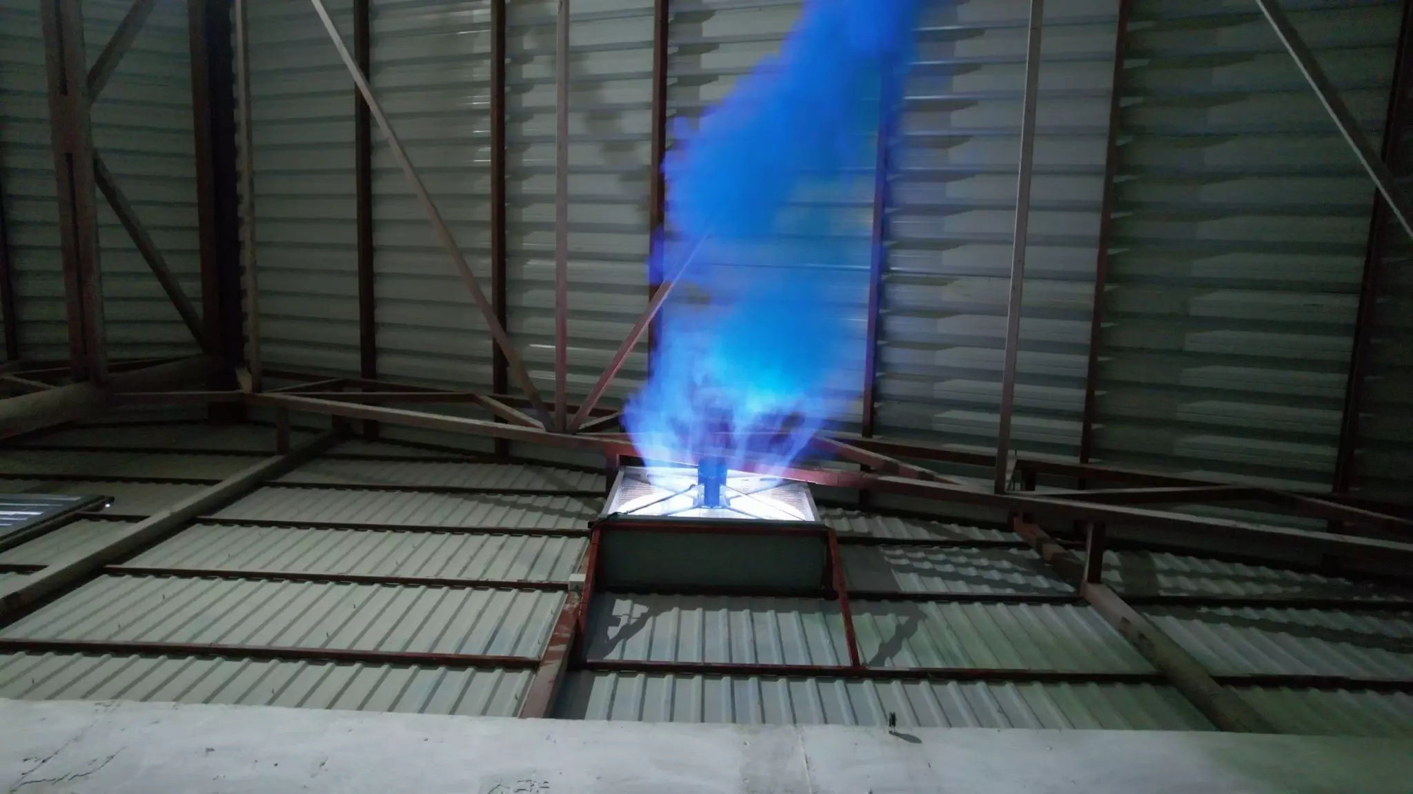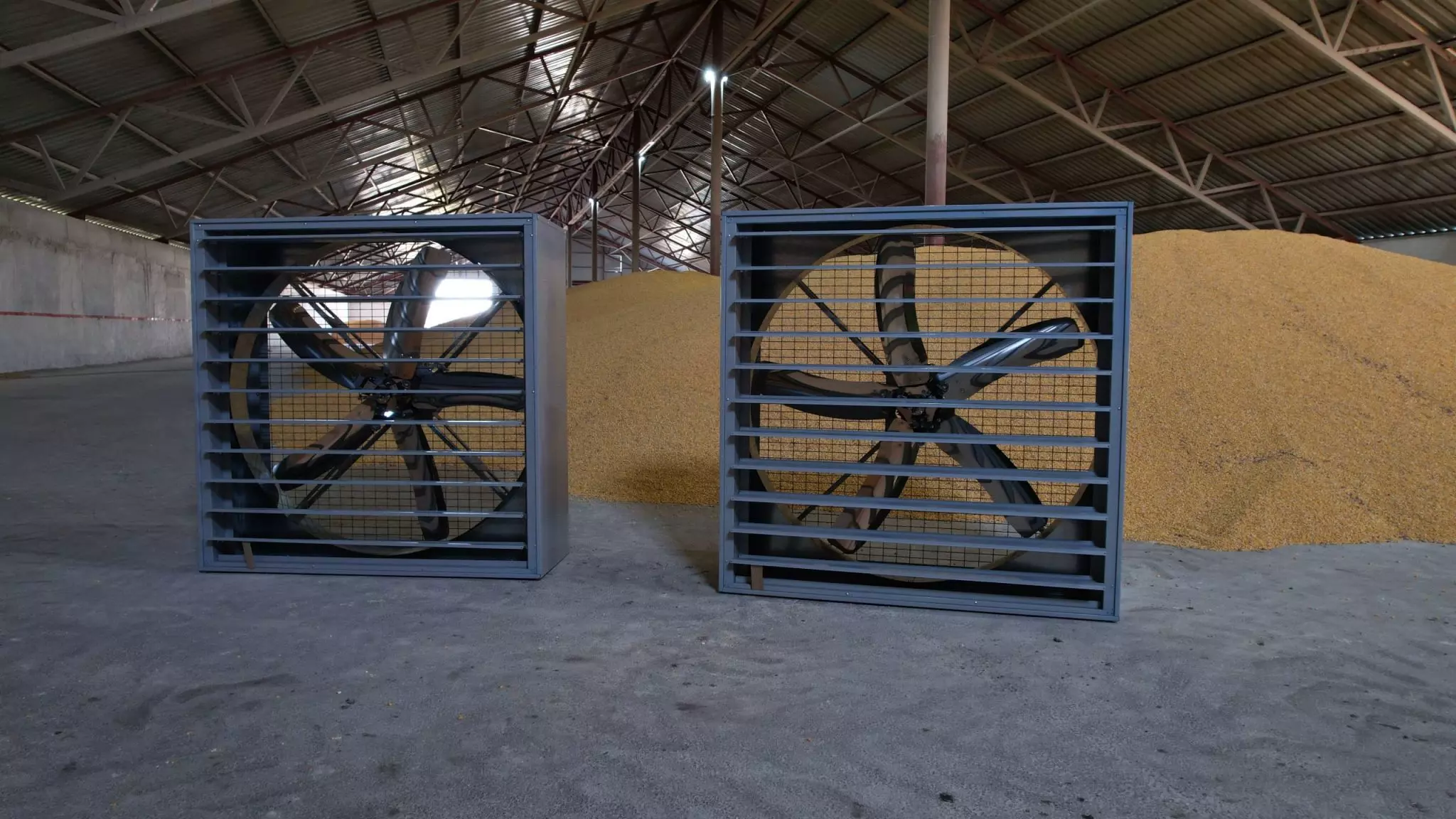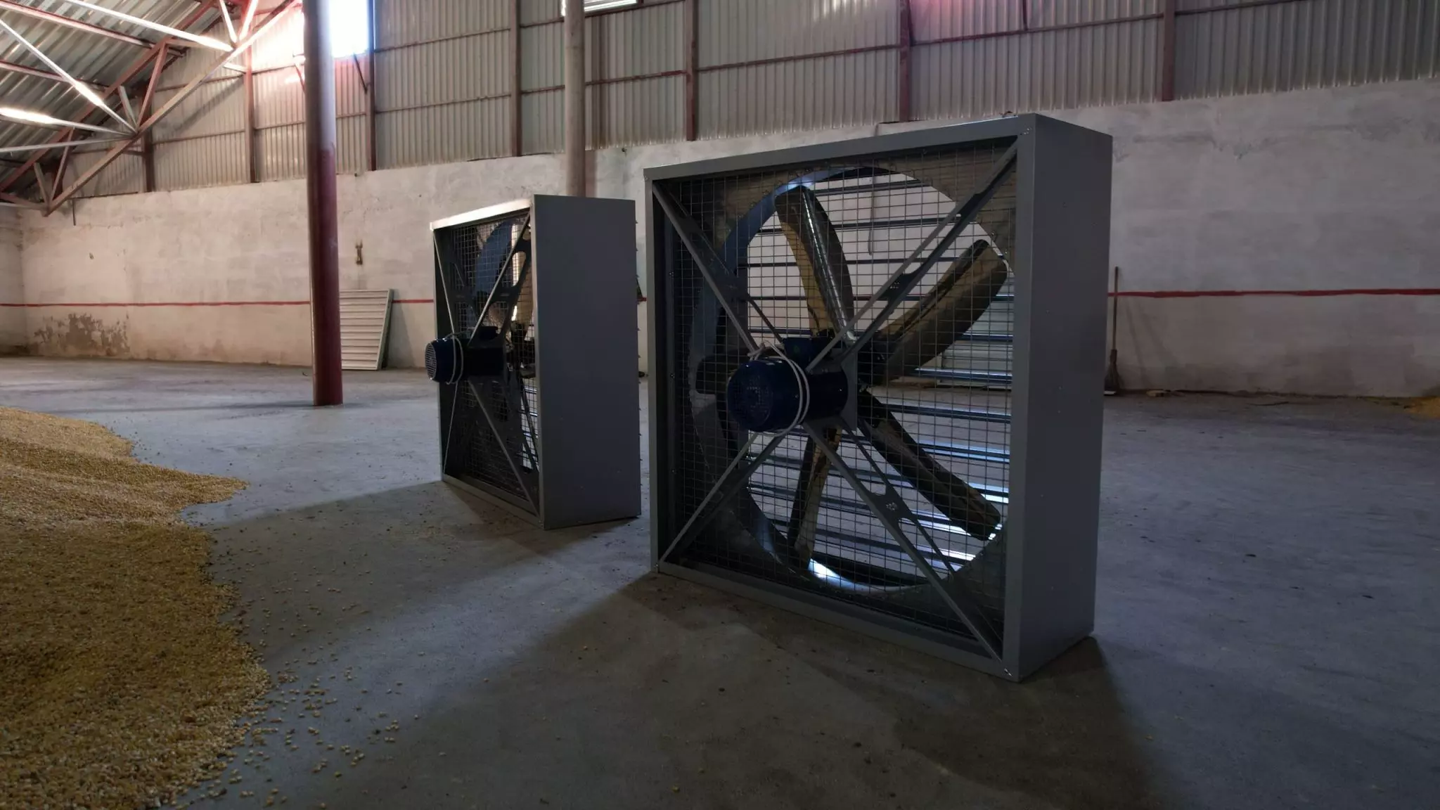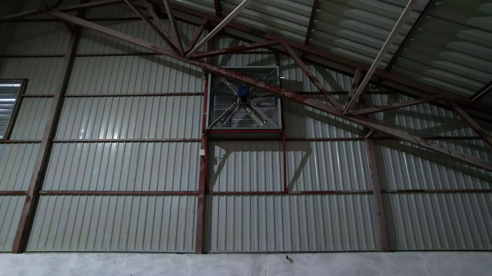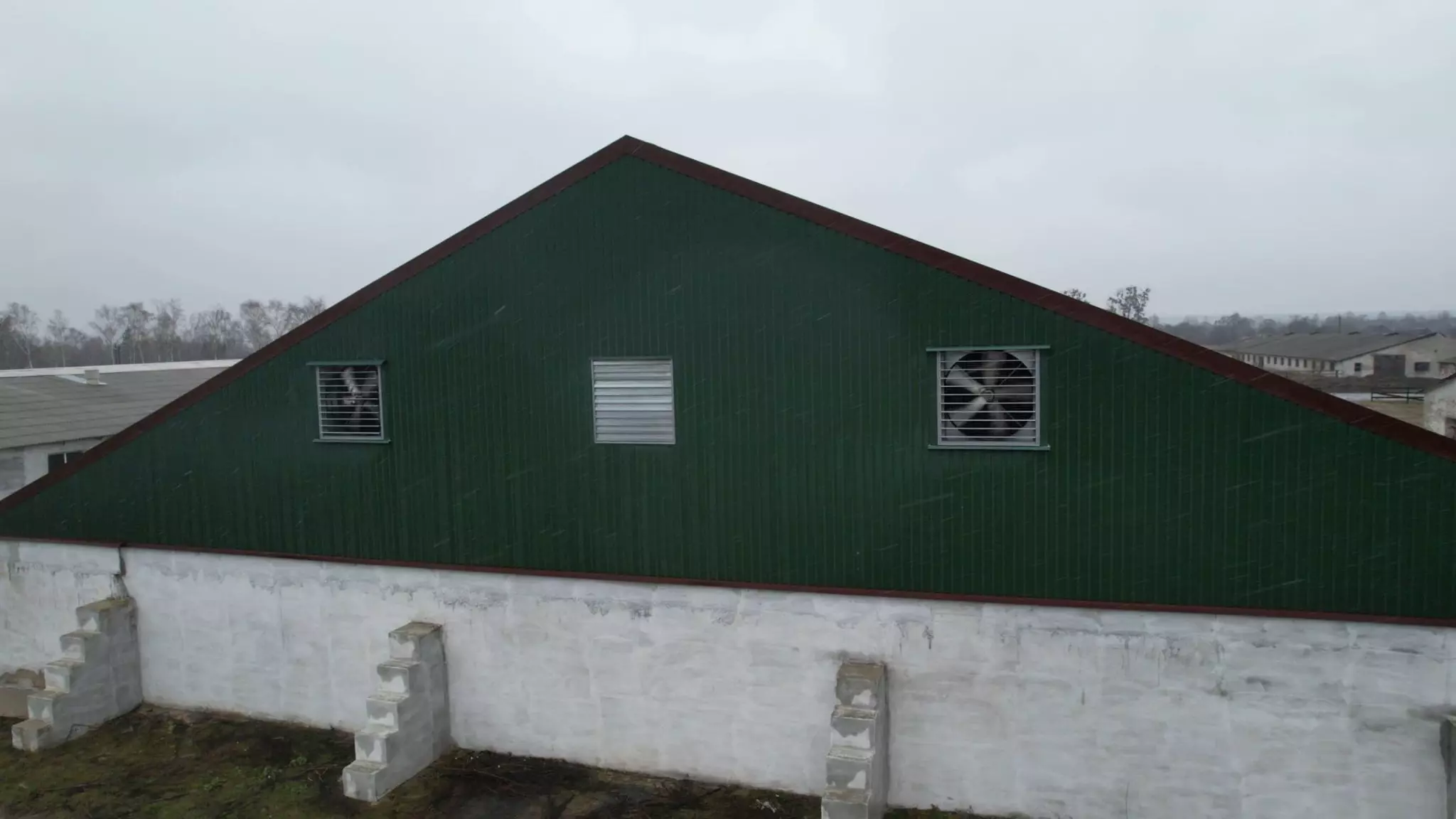Даний проєкт цікавий тим, що замовник попередньо встановив у обох фронтонах вентиляційні решітки стороннього виробника. Після року експлуатації ангару стикнувся з тим, що скупчується волога на покрівлі та не комфортно через пил працювати персоналу. Було прийнято рішення організувати приточно-витяжну систему за рахунок осьових вентиляторів.