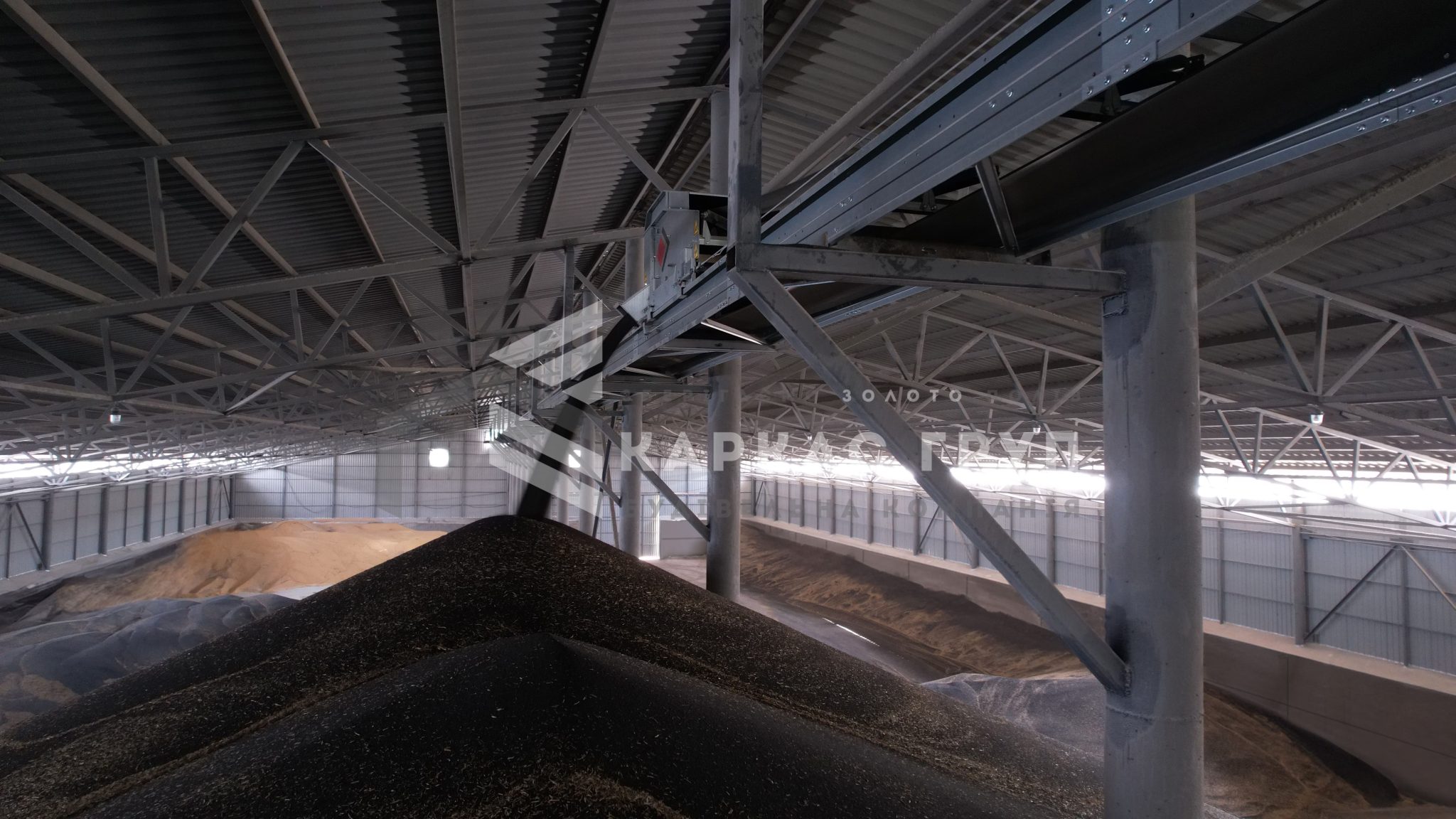 Продукция из завальной ямы транспортируется в зерносушилку от компании Bonfanti, после этого нория поднимает зерно на ленточный конвейер и происходит загрузка помещения.