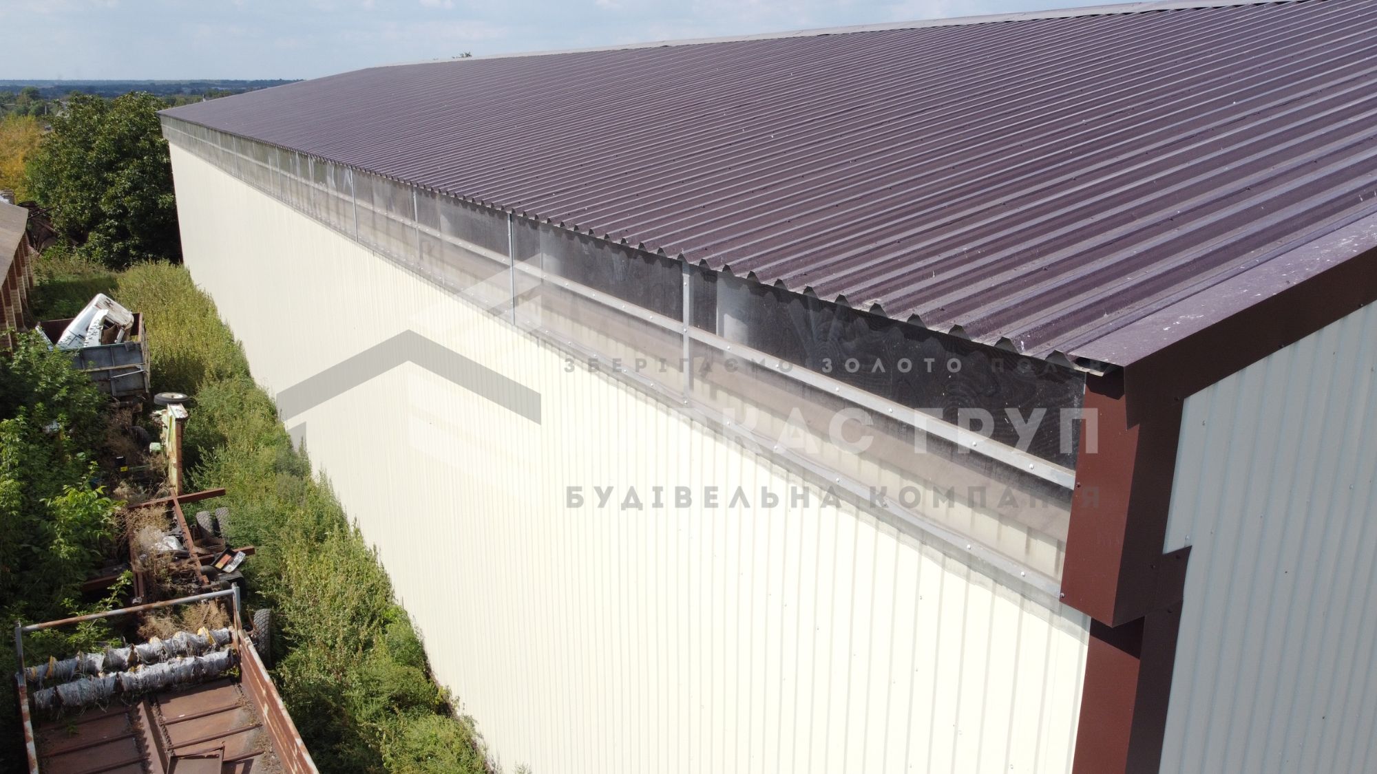 Склад для зерна имеет вентиляционные окна, которые располагаются под кровлей с обеих сторон и создают постоянное движение свежего воздуха и предотвращают порчу верхних слоев насыпи. В свою очередь окна обшиты монолитным поликарбонатом для светопроводимости и экономии электроэнергии.