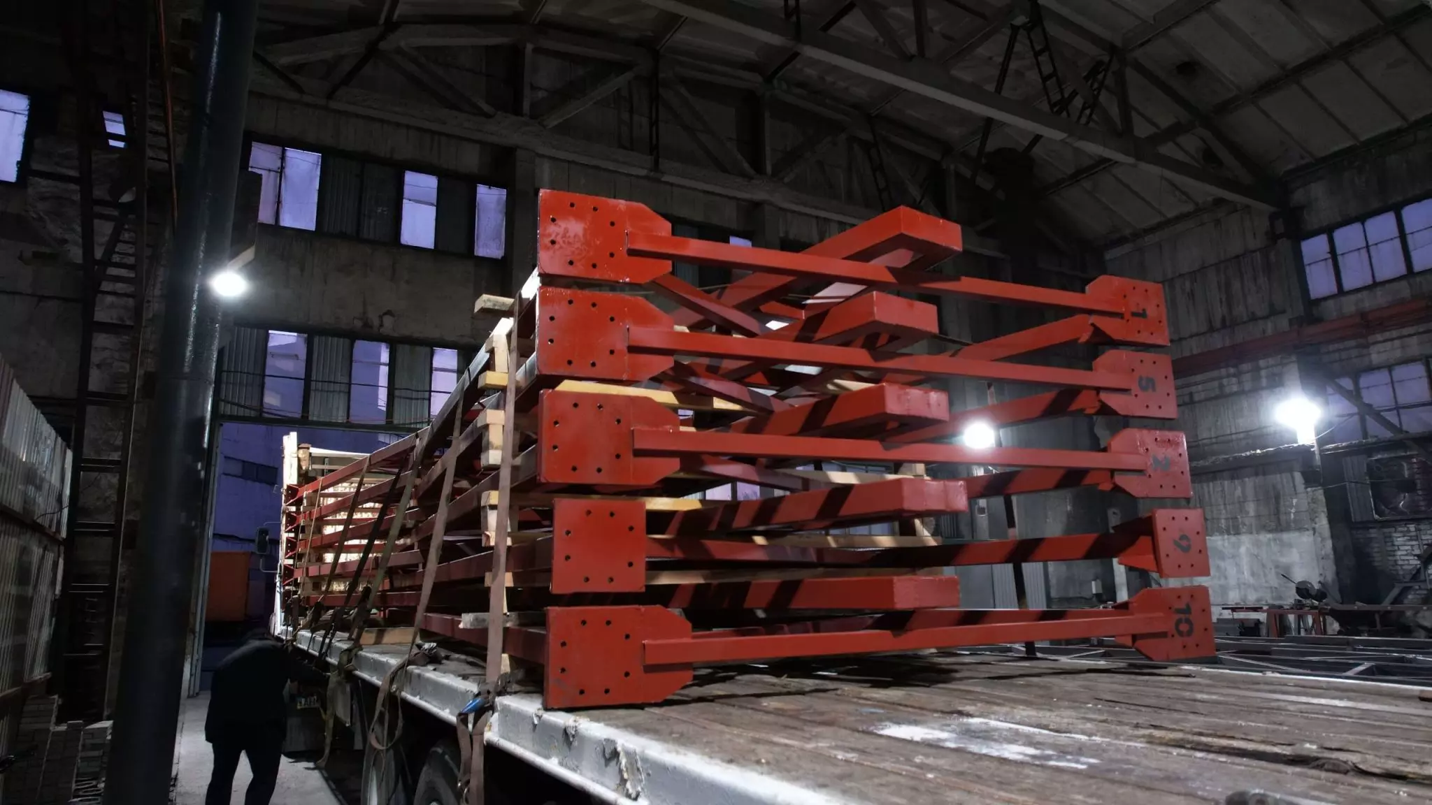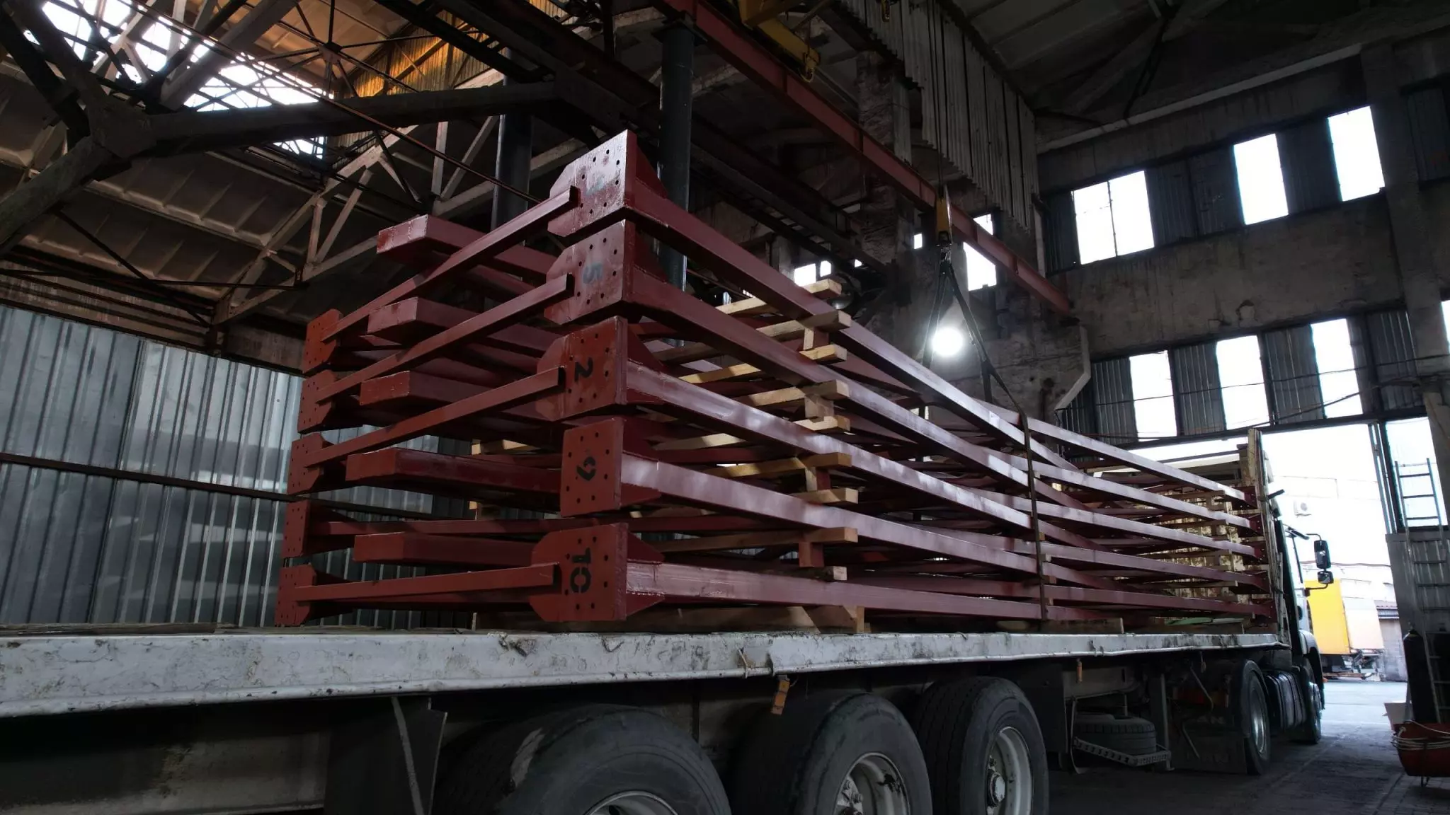 Проєктування металоконструкцій "Каркас Груп" Stacked metal parts of a pre fabricated building Fast built camp construction parts at the warehouse Bunch of different kinds of connecting plates stacked in neat piles Abstract industrial architecture background photo