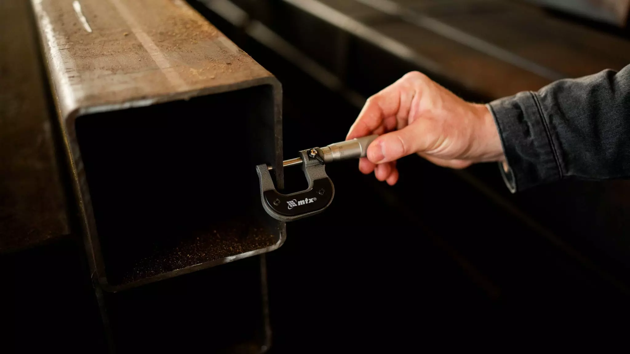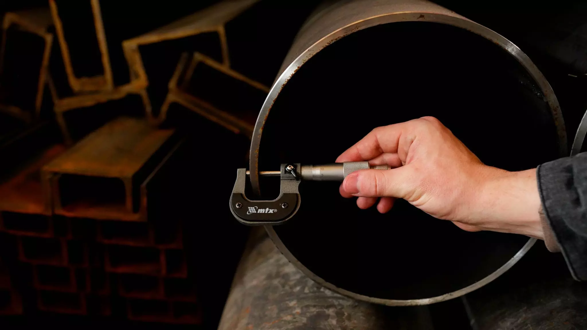 Гладким мікрометром перевіряємо товщину стінок профільних труб та листового прокату.